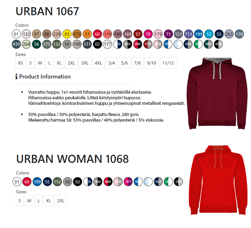 Roly URBAN huppari on collegehuppari tuplakankaisella hupulla. Saatavilla sekä yksivärisenä että kahden värin yhdistelmänä. Säätönauha kontrastivärissä sekä vahvistetut saumat pääntiessä ja kengurutaskussa. Hihansuut ja vyötärö elastaania sisältävää 1×1 resoria. Irrotettava tuotemerkki.
